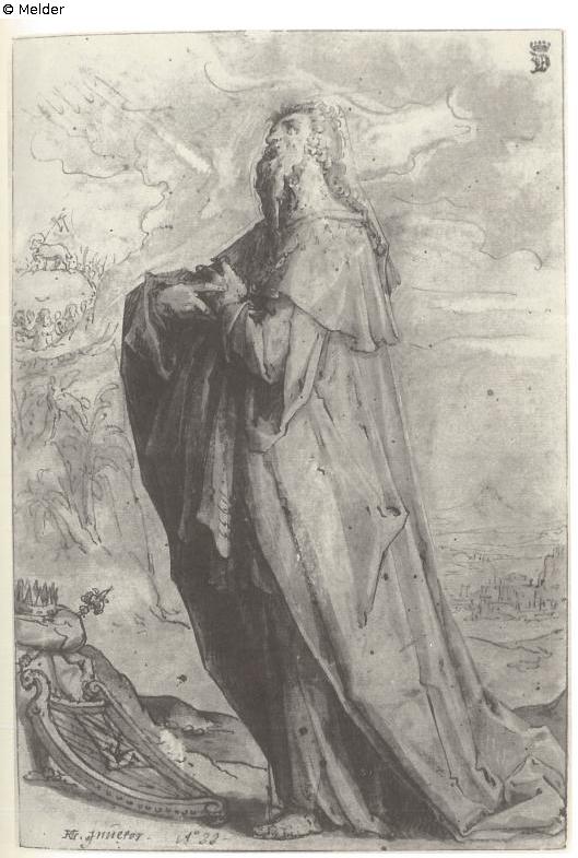 Zwarte Inventaris: -; Inventatiskaart: David in landschap. Met jaartal 1588. Pen, gew. in bister. Door Matham gegraveerd in serie B240.247 [niet handschrift Lugt]. Praag 8664 [niet handschrift Lugt]. Bibl. Reznicak Hendrick, Goltzius Zeichnungen, Utrecht 1961, Afb. 94. K. 21. p. 243 [niet handschrift Lugt]. Nu in Pruag, Narodni galerie [niet handschrift Lugt]. Uit XVIIIe eeuwsche scrapbook, verz. Lord Dalhousie, van P & D. Colnaghi & Co.