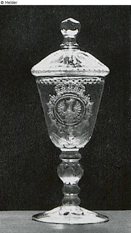 Auf der Kuppa der preußische Adler mit dem Namenszug F W R auf der Brust in einem gekrönten Rund, das von der Kette des Schwarzen Adlerordens umgeben ist. Blanke Kugelbordüren, am Ablauf, Knauf und Fuß matte Spitzblattfriese. Der Deckel nicht zugehörig. Potsdam, um 1720. Literatur: Auktionskatalog Hans W. Lange, Wertvolles Kunstgewerbe, Berlin, 19.-21. Mai 1941, S. 63. Nr. 263, Taf. 42 (DOI: Externer Link)