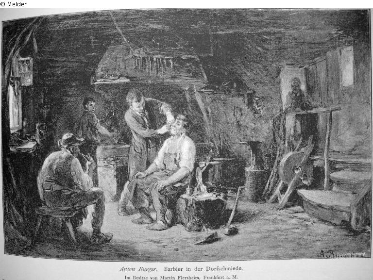 Inmitten einer niedrigen dunklen Schmiedewerkstatt sitzt auf dem Ambosstock, beleuchtet vom Fenster links, der Schmied und lässt sich vom Dorfbarbier rasieren. Ein alter Bauer mit Hut und Pfeife sitzt links; der Lehrbub am Feuer im Hintergrund dreht sich der Gruppe zu und eine alte Frau kommt von rechts oben zur Tür herein. Schmiedegerät steht umher. Bez. r.u. A. Burger 69. Abb. In "Die Kunst unserer Zeit" V (1894) 2, S. 61; ausgestellt 1894 in München im Königlichen Glaspalast