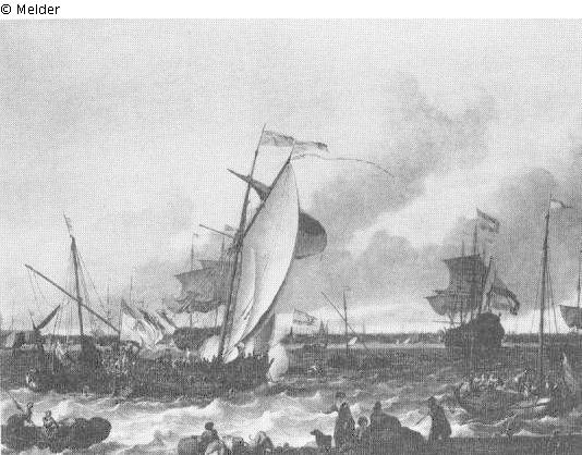 Vor der niedrigen Stadtsilhouette mehrere Segelschiffe und -boote unterschiedlicher Größe, teilweise mit gehißten Segeln, Figurenstaffage in den (Ruder-)booten und auf der Mole (?) im Vordergrund, ein sich der Bildmitte näherndes Kriegsschiff (Einmaster) feuert backbord eine Kanone ab, am Heck des Schiffes eine zweifarbige Flagge mit Wappen; Signatur: L. BAKH 1707; Maße: 97 x 126 cm