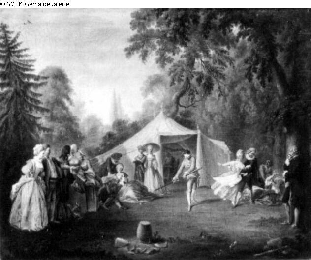 Tafelmalerei: Bild: Erwachsene spielen Kinderspiele; Spiel; Wettstreit; Spiel; Wettstreit; Kinderspiele; Signatur: l.l.: D. Chodowiecki/1768; Maße: 63 x 78 cm