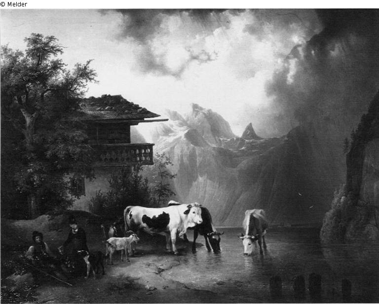 Rechts ein Teil des Sees, im Hintergrunde von hohen Kalkfelsen umschlossen. Links an seinem Rande zwei Ziegen, ein prächtiger braun und weiß gefleckter Stier und zwei Kühe, von denen eine im Wasser steht. Weiter nach links sitzt auf dem erhöhten Uferrande ein Hirte, dem eine Frau einen Krug reicht. Ihr zur Seite ein Hund. Hinter der Gruppe erhebt sich eine Eiche und hinter derselben wird ein Bauernhaus mit weit vorspringendem Balkon sichtbar. Dunkle Wolken verkünden das Nahen eines Gewitters. Bez. links unten: F. Gauermann 1833