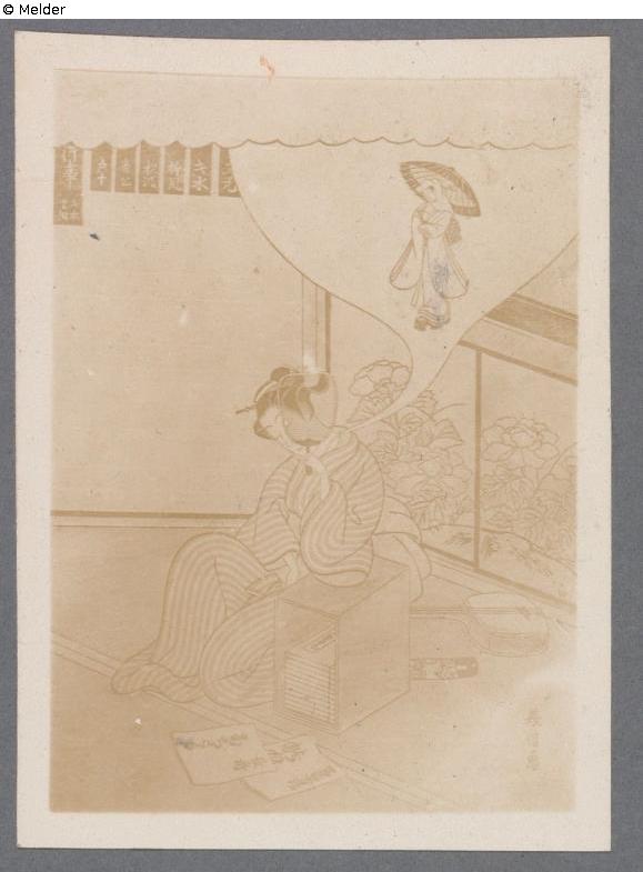 An einem Buchkasten mit Modebildern angelehnt,ist eine junge Dame eingeschlafen; Fächer bedeckt einen Teil ihres Gesichtes; träumt von der neuesten Wintertoilette; Hinten Samise/Schiebetür; oben Modefirmennamen; zarte grüne, rosa, braune Farben. Reliefpressung