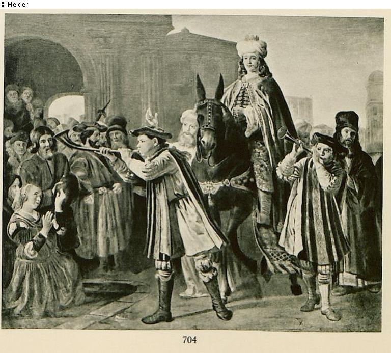 Die auf dem Gemälde dargestellte biblische Szene rekurriert auf das sogenannte Alte Testament: Buch Esther 6,7-11. Der Jude Mardochai wird mit königlichem Gewand und Kopfschmuck ausgestattet, auf einem Pferd reitend, durch die Straßen geführt und geehrt.