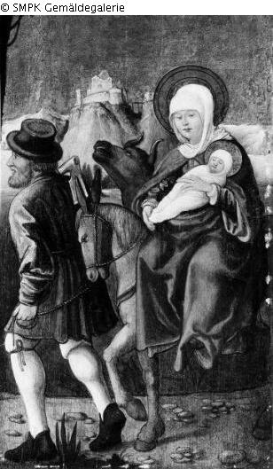 Tafelmalerei: Bild: die Flucht nach Ägypten: Maria, Joseph und das Kind (zusätzlich können andere Personen dargestellt sein) sind unterwegs; in der Regel reitet Maria auf einem Esel; die Landschaftsdarstellung ist von geringer Bedeutung; Reise; Esel