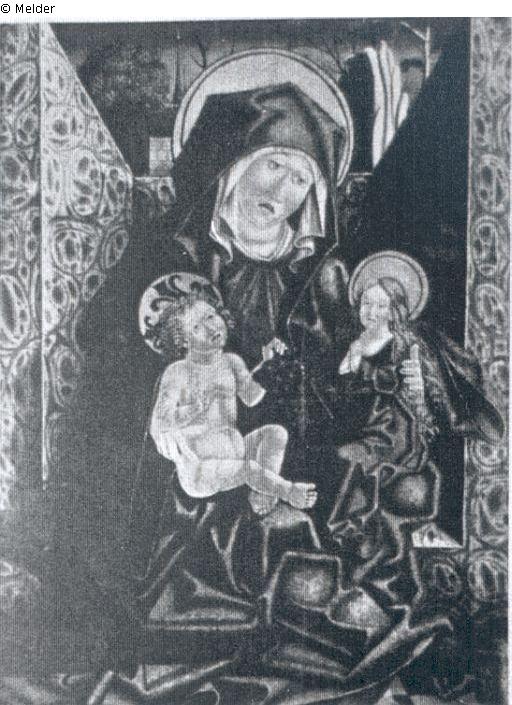 Die hl. Anna Selbdritt. In ornamentiertem Mauerwerk sitzt die hl. Anna in rotem faltigem Gewand, den Christusknaben und die hl. Maria auf dem Schoß haltend. Öl auf Holz, 48x36 cm