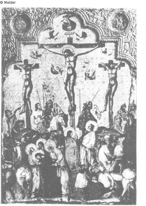 Ursprünglich dem Simon Memmi zugeordnet; Jesus am Kreuz, zwei gekreuzigte Sünder im Hintergrund, viele Personen zu Füßen der Kreuze, einige mit Heiligenschein; Graf von Ingenheim´sche Bildersammlung, Erbinventar - Gemäldeverzeichnis: Nr. 8, Reisewitz, 1883; Böttiger, C. A., Gemäldesammlung des Grafen von Ingenheim, "Artistisches Notizenblatt", Beilage zur Abendzeitung III (1827), S. 26-28; Coletti, L., I Primitivi, vol. 3, I. Padini, Novara 1947; Boskovits, M., Frühe italienische Malerei, Gemäldegalerie Berlin, 1988; Goldgrund