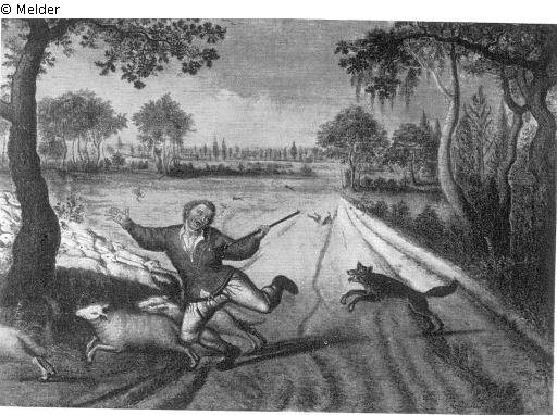 Die Parabel vom ungetreuen Knecht. Auf einer breiten in die Bildfläche sich verlierenden Straße sucht der Hirte sich in eiligem Lauf vor dem ihn anspringenden Wolf zu retten. Die Schafherde eilt nach li. in voller Flucht davon, monogr. li.vorne am Baumstamm: L V V