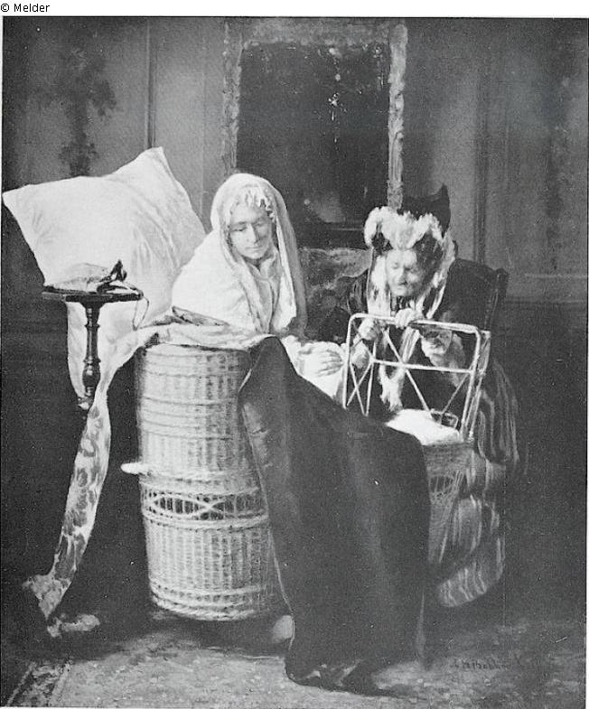 Eine Innenraumszene mit einer Großmutter und einer Mutter, die in eine Wiege schauen. Rückseitig vom Künstler beschriftet, datiert 6. Januar 1871