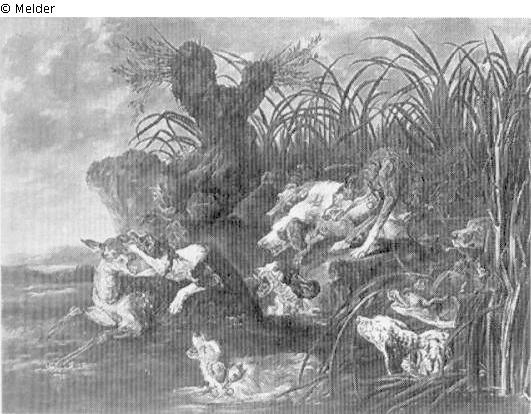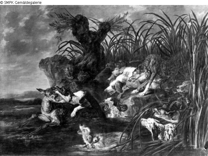 Tafelmalerei: Bild: Jagd auf eine Hirschkuh & Jagdhunde & Landschaften mit Gewässern (in der gemäßigten Zone), Seestücke; Hirschkuh & Hund & Landschaft; Gewässer