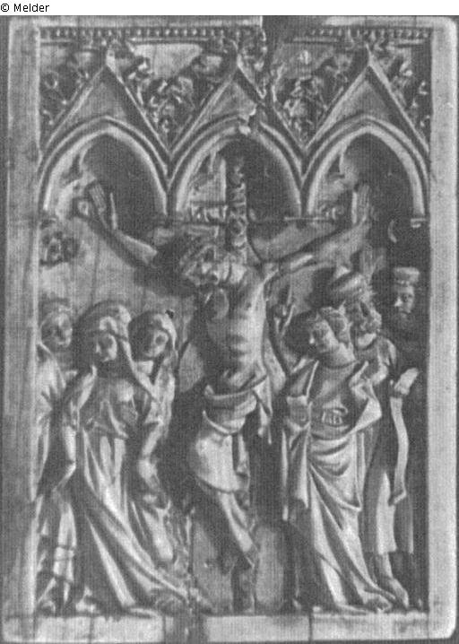 Kreuzigung, rechts vom Gekreuzigten Maria, gestützt von zwei Frauen, links entsprechend Johannes Nikodemus u. Joseph von Arimathia. Das ganze überfangen von drei Spitzbögen, darüber krabbengeschmückte Wimperge. Geringe Farbreste in Rot (im Mauerwerk), rec