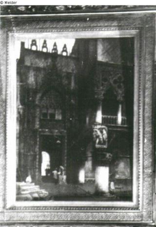 Aufwendiger Bilderrahmen mit girlandenartigem Blumen/Fruchtband; Dogenpalast in Venedig, architektonische Malereidarstellung eines Gebäudeteils des Palastes