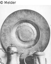 Metallkunst - Zinnschüssel aus geätzter Form. Rand: Füllhörner, Vögel und Ranken; Mitte: Doppeladler in Ranken; Grund gestrichelt.