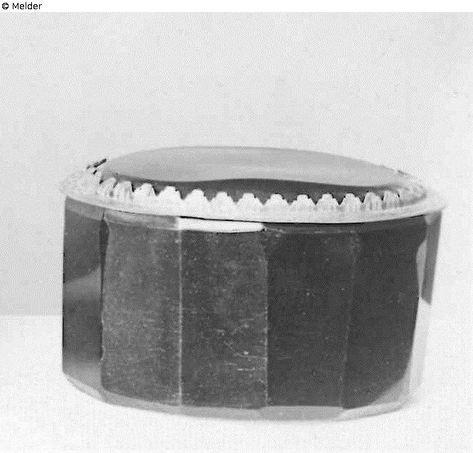 oval, außen dreizehnfach facettiert, der Deckelrand in Silber gefasst, mit Augsburger Beschau und Stempel TB im Rand (R³ 708, ohne Namen)
