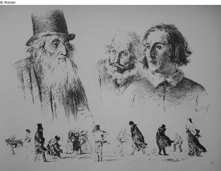 bezeichnet rechts unten: A. Menzel 1843, Nr. 2, VI., beiliegend Dublette, späterer Abdruck, Radierversuche, Mappe, enthaltend Titelblatt, sechs Radierungen und drei Dubletten, 1. Auflage