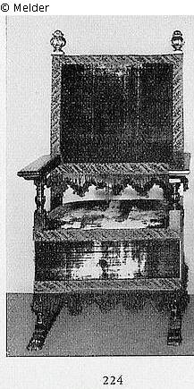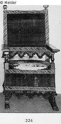 Schwarz gelackt, mit rotem Seidenveloursbezug auf der geraden Lehne, dem Sitzpolster und auf allen vier Seiten, gedrechselte Armlehnstützen, die Beine auf Kufen, die Lehnpfosten bekrönt von vergoldeten Akanthusknaufen