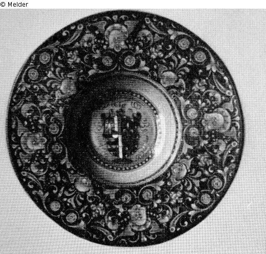 bemalt auf blauem Grund mit hellblauen, weiß gehöten Arabesken, im tiefen Spiegel vielteilges, farbiges Wappen. Ein Teller gekittet.