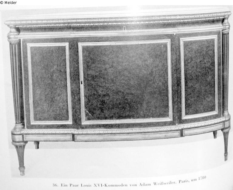 rechteckig, die Vorderseite zwischen durchgehenden kannelierten Säulenfüßen in drei Teile gegliedert, der Mittelteil leicht vorspringend. Reiche ziselierte Bronzefriese. Weiße Marmorplatten. Mahagoni. Ein ähnliches Stück im Metropolitan Museum, New York. Arbeit des A. Weißweiler, geb. in Neuwied, Schüler von David Roentgen, war neben Riesener und Carlin einer der bedeutendsten Ebenisten am Ende des 18. Jahrhunderts; Quelle: Jacques Seligmann & Co Records, General Correspondence, 1913-1978: Feist, Dr. Hans, 1938. Unter www.aaa.si.edu/collections/container/viewer/Feist-Dr-Hans--288202, Dokument 1274048 und 1274053; Galerie Fischer: Große Kunstauktion in Luzern. Sammlung Frau Hermine Feist, Wannsee u.a. am 20., 21., 23. und 24. Mai 1941. Luzern 1941. Katalognummer 36; François de Salverte: Les Ébénistes du XVIIIe siécle. Leurs Œuvres et leurs Marques. Paris 1953. S.315f; Hans Feist an Theodor Fischer vom 22.06.1942, in: Nachlaß Feist, in: Literaturarchiv Marbach; Auktionsvertrag zwischen Dr. Hans Feist und Dr. Theodor Fischer vom 28.10.1940, in: Nachlaß Feist, in: Literaturarchiv Marbach; Auktionsabrechnung für Bankhaus Adler & Cie, Zürich, über die verkauften Nummern der Sammlung Feist-Wollheim.