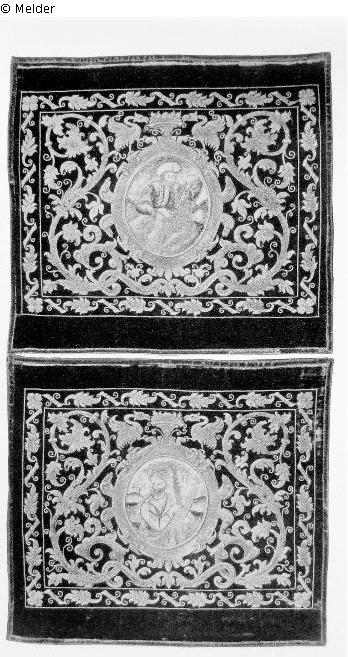 aus rotem Seidenvelours mit reicher Goldapplikationsstickerei in Gold und Silber: symmetrisches Ranken- und Blattwerk um eine Rollwerkkartusche mit der Halbfigur eines Apostels in farbiger Seidenstickerei.