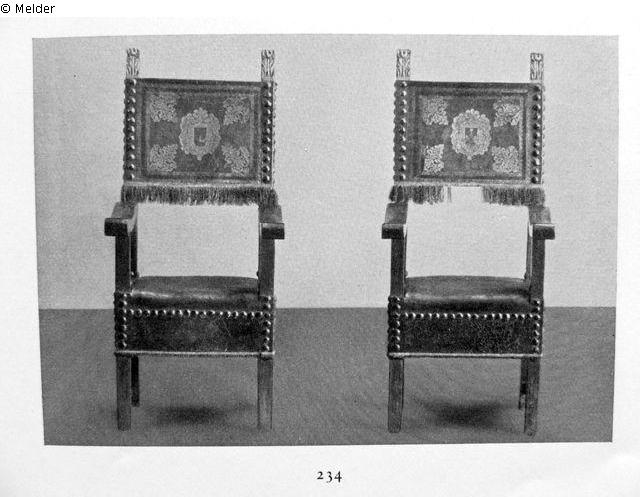 Suchmeldung | Einzelobjekt Ein Paar Renaissance-Armlehnsesel Lost Art-ID415006 Vorherige Weiter Hersteller/Künstler:in Unbekannt (Italienisch) TitelEin Paar Renaissance-Armlehnsesel Datierung1501/1600ObjektartMöbelObjektgruppeMöbelMaterial / TechnikHolz (Nussbaum) Höhe 142,00 cm Breite 64,00 cm Beschreibung Nußholz. Gestell aus Vierkanthölzern, die Lehnenpfosten bekrönt von vergoldeten Akanthusblättern. Lederbezug mit Goldpressung. Grüner Fransenbesatz. Weiterlesen Weniger anzeigen Provenienz Versteigerung Paul Graupe, Berlin, am 17./18.06.1936 unter Nr. 234; Abbildung Versteigerungskatalog Tafel 51 Weiterlesen Weniger anzeigen Veröffentlicht seit2009 Ansprechpartner:in von Trott zu Solz LammekPositionRechtsanwälte • NotarTel+49 (0) 30 59 00 33 0-0E-Mailkanzlei@vontrott-lammek.de