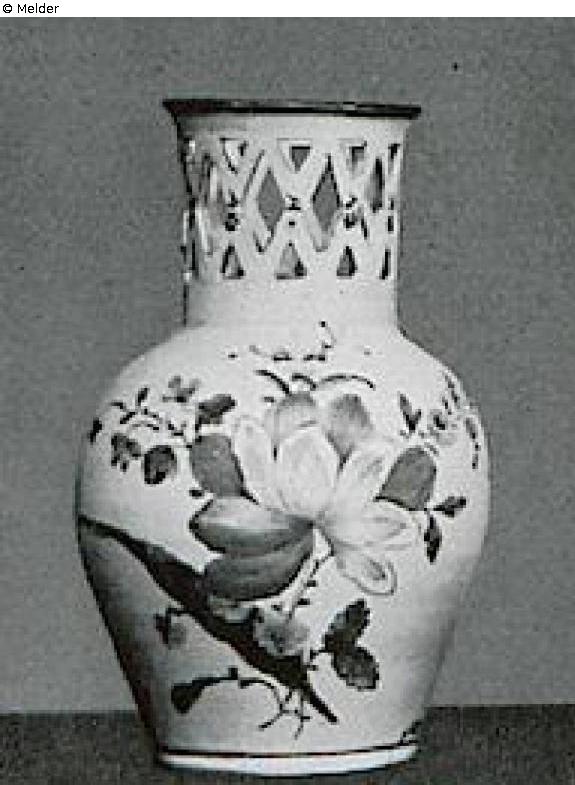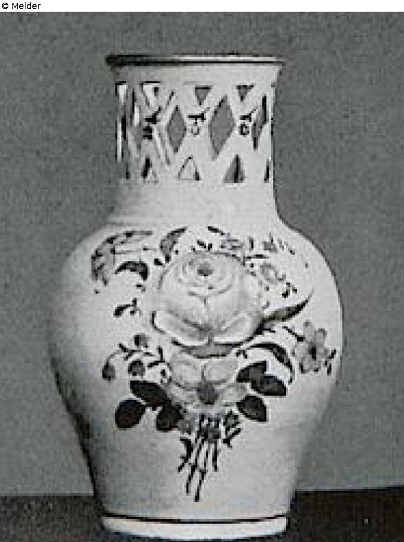 mit gegitterten Hälsen. Bemalt mit bunten Blumensträußen, Streublümchen und purpurnem Rand. Ein Vasenhals ausgebessert. Glinitz, um 1780. Marke: G. Literatur: Auktionskatalog Hans W. Lange, Wertvolles Kunstgewerbe, Berlin, 19.-21. Mai 1941, S. 83. Nr. 382, Taf. 46 (DOI: Externer Link)