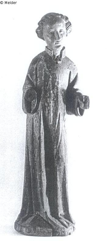 in langer, ungegürtet herabfallender Tunika, das Haupt ein wenig geneigt, die Arme eingewinkelt. wohl hielt er ursprüngl. ein Spruchband. Beide Hände u. Flügel abgebrochen, der Rücken angestückt. Geringe Reste der urspr. Fassung, Lindenholz, vollrund