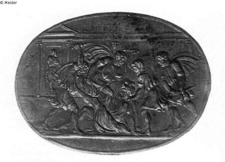 Ovale Plakette, schmale Randleiste. Der zu Boden gestürzte Caesar stützt sich auf den linken Arm und hält die Rechte zur Abwehr über den Kopf erhoben. Von links und rechts dringen je zwei Verschwörer mit Dolchen auf ihn ein. Im Hintergrund sieht man eine Säulenarchitektur, links in einer Nische steht eine Statue des Pompejus. Nach einem geschnittenen Stein, der 1865 mit der Slg. Pourtalès versteigert wurde und vielleicht identisch ist mit dem Bergkristallschnitt (um 1530) im Deckel einer Dose der Collection Dutuit im Palais des Beaux Arts de la Ville (Petit Palais) in Paris. Unser Museum besaß eine Kamee (Inv.Nr. 1917.415) mit der gleichen Darstellung, aber ohne Hintergrund, die ebenfalls aus der Slg. Eisner stammt.