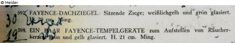 Sammlung Eduard Fuchs, wahrscheinlich erworben nach 1924 und in dessen Besitz bis 1933; 25.10.1933 Beschlagnahmung durch die Gestapo; zwangsweiser Verkauf (Zahlung Reichsfluchtsteuer) durch seine Tochter Gertraud Fuchs: Versteigerung Auktionshaus Rudolph Lepke Berlin, Katalog 2115, S. 37 - am 15.10 und am 16.10.1937 wurde diese Tempelgeräte unter Nr. 598 versteigert: „EIN PAAR FAYENCE-TEMPELGERÄTE zum Aufstellen von Räucherkerzen. Grün und gelb gla-siert. Höhe 21 cm. Ming“.