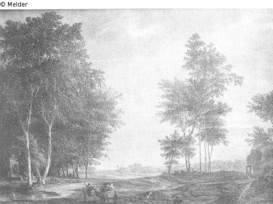 Links Wald mit einer Quelle, im Vordergrund ein Gespann mit Wagen und mehreren Personen, rechts hinter lichter Baumgruppe offene Flachlandschaft, rechts angeschnitten ein Felsen (?); Signatur: Agricola f; Maße: 33,5 x 48 cm