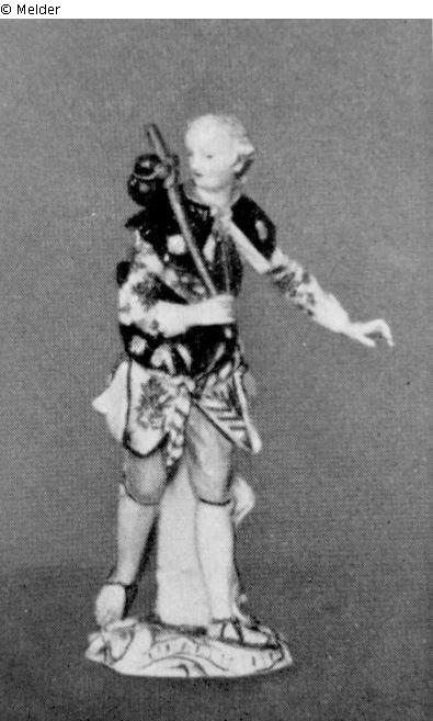 auf goldstaffierten Rocaillensockeln, er in Schreitstellung mit Pilgerflasche an Stange, sie mit Lammstab. Bunte Bemalung: Geblümter hellgelber Rock, hellvioletter, vorn geschürzter Pilgerrock, lila Taille, schwarzer Pilgerkragen, gelber Krempenhut.- Violette Hose, violetter, geblümter Schoßrock, schwarzer Pilgerkragen. Reparatur. Marke: Blaue Schwerter.