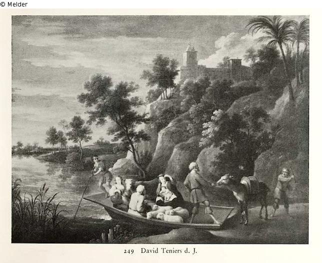 Lempertz: Im Boot, das vorn rechts am Fuß eines steilen baumbewachsenen und burggekrönten Felsens angelegt hat, sitzen zwei junge Frauen, die eine mit einem Kind auf dem Schoß, und ein alter Hirt neben mehreren Schafen und einer Kuh. Ein anderer Hirt und ein Knabe strengen sich an, einem störrigen Reitesel in das Boot zu bugsieren, während der Ferge vorn auf dem Boot, zur Abfahrt drängend, sich auf seine Ruderstange stützt. Abendstimmung. Bezeichnet (unten in der Mitte): D. Teniers. Gestochen von der Gegenseite, mit kleinen Veränderungen von Weißbrot und Daudet. - Der Stich wird beigegen.