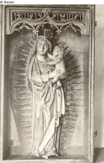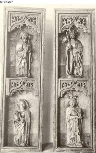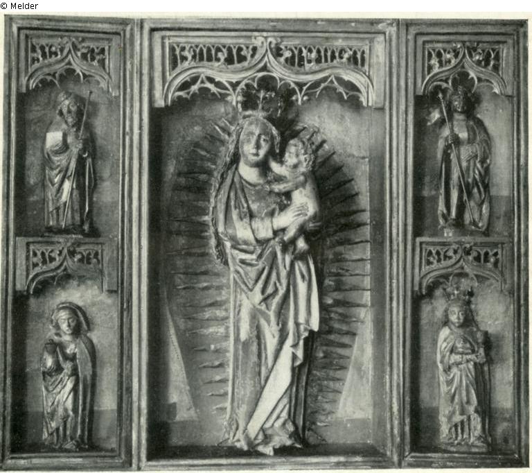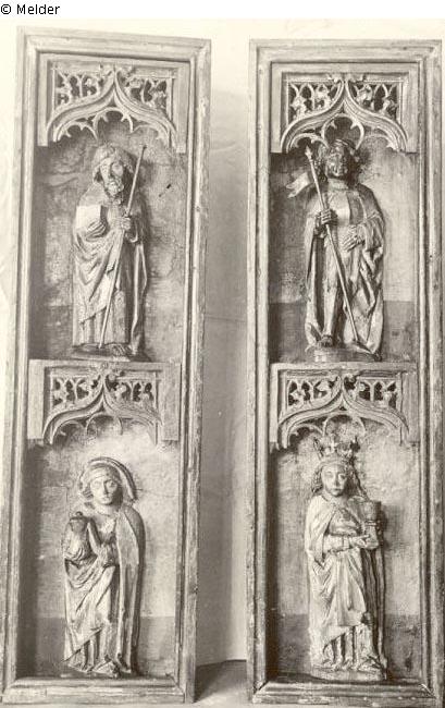 Maße - Schrein: 108 x 62,5; rechter Flügel: 108 x 31,2. Der linke Flügel und die Marienfigur sind nur erhalten. Rechter Flügel als Kriegsverlust: Oben der Hl. Mauritius in Rüstung und Mantel mit der Fahne in der rechten Hand; Rüstung golden, Oberteil grün; Mantel golden, blau gefüttert; Schuhe rot. Unten die Hl. Barbara mit Kelch; Untergewand grün, Mantel golden, blau gefüttert.