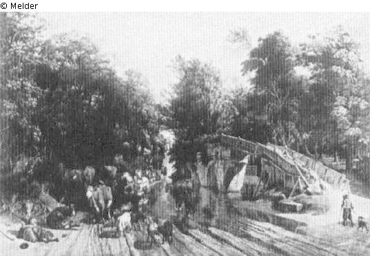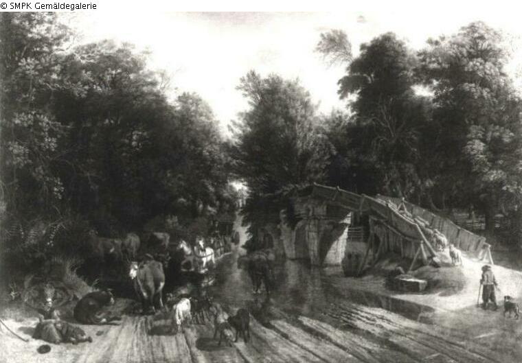 Flußlandschaft mit Brücke und Furt