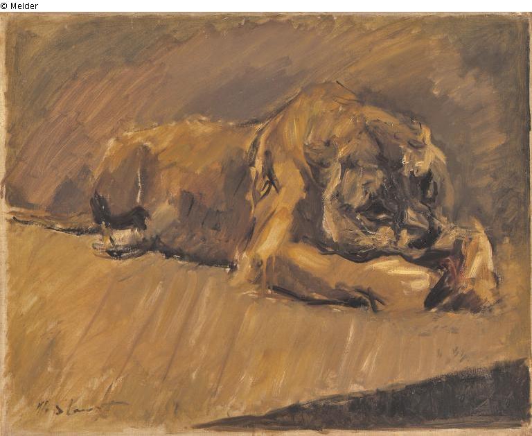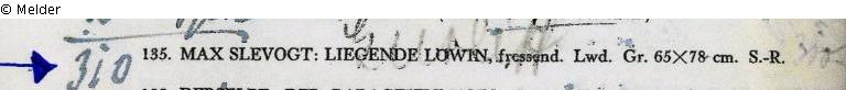 Sammlung Eduard Fuchs spätestens seit 1909 bis 1933; 26.10.1933 Beschlagnahmung durch das Finanzamt Berlin-Zehlendorf „Paket Nr. 5: 1 Bild, darstellend eine Löwin aus dem Jahre 1901 (Slevogt)“; Übergabe des Gemäldes am 15.12.1933 an die Gestapo; Versteigerung Auktionshaus Rudolph Lepke, Berlin, Katalog 2114, S. 16. Am 16. und 17.06.1937 wurde das Gemälde als Nr. 135: „Max Slevogt: Liegende Löwin – fressend. Lwd. Gr. 65 x 78 cm. Silberrahmen“ versteigert; ersteigert von Kunsthändler Hildebrand Gurlitt für RM 310,- (Schätzpreis: RM 300,-); um 2000 wahrscheinlich Versteigerung bei Grisebach; Verbleib unbekannt