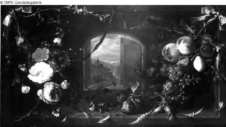 Tafelmalerei: Bild: Stilleben mit Pflanzen, Blumen und Früchten & Girlanden, Blumengewinde (Ornament) & offenes Fenster; Stilleben; Pflanze; Blume; Frucht; Insekt & Girlande & offenes Fenster; Signatur: Unten rechts: J - DDe Heem f -; Maße: 37 x 68 cm