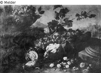 Zwischen einem Brunnen und einer Säulenbasis Kürbis, Trauben, Blumenkohl, Granatapfel, Aprikosen, Pflaumen u. a. Im Hintergrund eine Stadt am Meer.