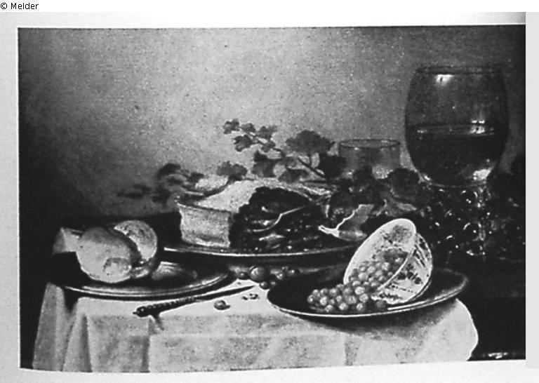 Auf einem Tisch mit weißer Decke liegt in der Mitte auf einem zinnernen Teller eine Pastete, daneben andere Zinnteller, Walderdbeeren in einer blauweißen Schale und ein Brot. Rechts zwischen Weinranken ein Römer und dahinter ein Bierglas, vorn ein Messer und Nüsse. Bezeichnet links mit Monogramm und 1644 datiert. Schwarzer Rahmen. Ausstellung "Het Stilleven", Amsterdam 1933. Kat.-Nr. 62.