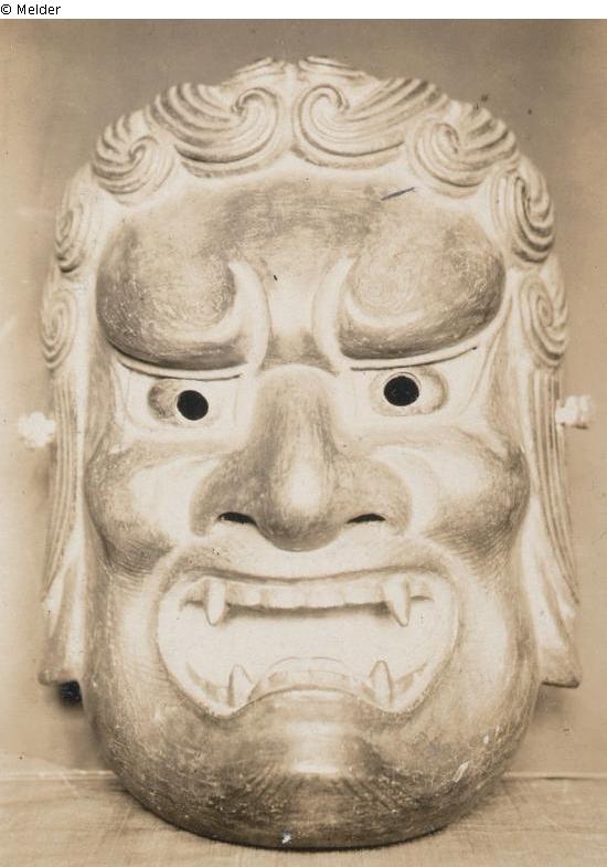 Buddhistische Gottheit der Weisheit;einer der acht Lebenshelfer in der japanischen Astrologie. Die Maske ist signiert: Mitsumoto.