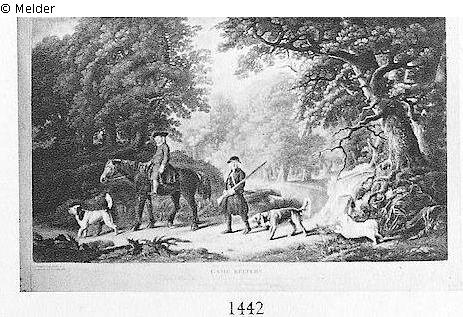 Zwei Jäger, einer von ihnen reitet, ziehen mit drei Hunden auf einem Waldweg vorüber. In Farben gedruckt. Qu. Fol. Voller Rand. Biedermeier-Goldrahmen. Gegenstück zu Auktion Ottmar Strauss bei Helbing Frankfurt (Main), Nr. 45, 24. Mai 1935, Lot 1441, Abbildung Tafel 86