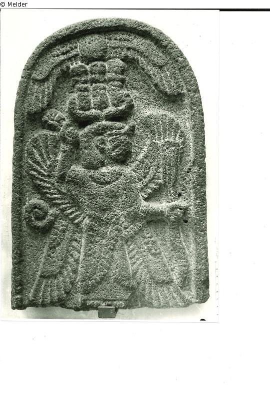 Plastische Natursteinarbeit. Gerahmtes Bildfeld mit Darstellung eines vierflügeligen, nach rechts gewandten Mannes. Auf dem Kopf eine dreiteilige Krone, in den erhobenen Händen ein Ährenbündel und eine Blüte. Volute auf dem Rücken. Über der Krone eine geflügelte Sonnenscheibe, die sich dem bogenförmigen Abschluss des Steines anpasst.