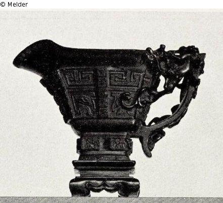 aus Nashorn in Form eines alten Bronzegefäßes, mit Drachenhenkel, im Innern kleiner, aufsteigender Drache. Auf geschnitztem Holzfuß. China. Kien-Lung.