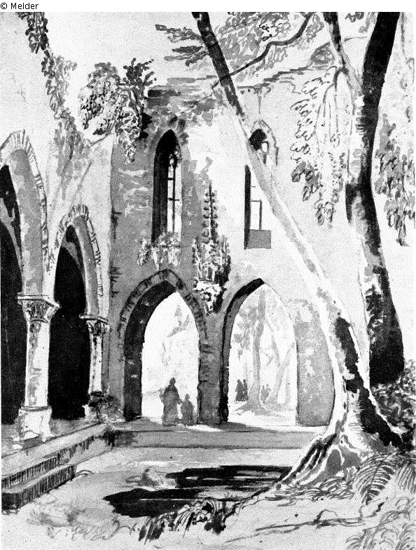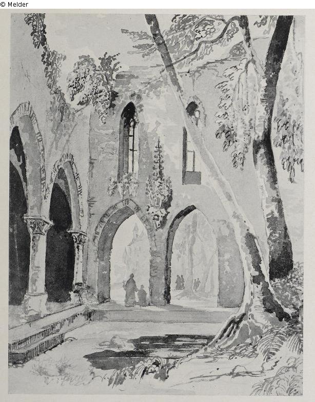 Die Ruinen des Kreuzganges einer gotischen Kirche, Sepia und Tusche (Pinsel), 36,5 x 28,2 cm (nach Rave 1867). Zwei hohe Bäume rechts im Vordergrund.