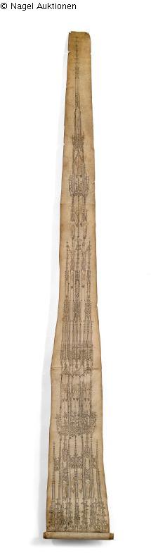 Vier verleimte Pergamentblätter (Abb. liegt intern vor). Aufrisszeichnung eines Sakramentshauses mit schwarzer Tusche mit Zirkel und Lineal über einer Blindrillenvorzeichnung ausgeführt. Heiligenfiguren nachträglich mit brauner Tusche eingezeichnet. Sekundär eingetragene Bleistiftmarkierungen und drei blasse unleserliche Worte in der Schrift des 19. Jahrhunderts. Seitliche Bleistiftbeschriftung nennt Burkharde Engelberg als möglichen Planverfasser.