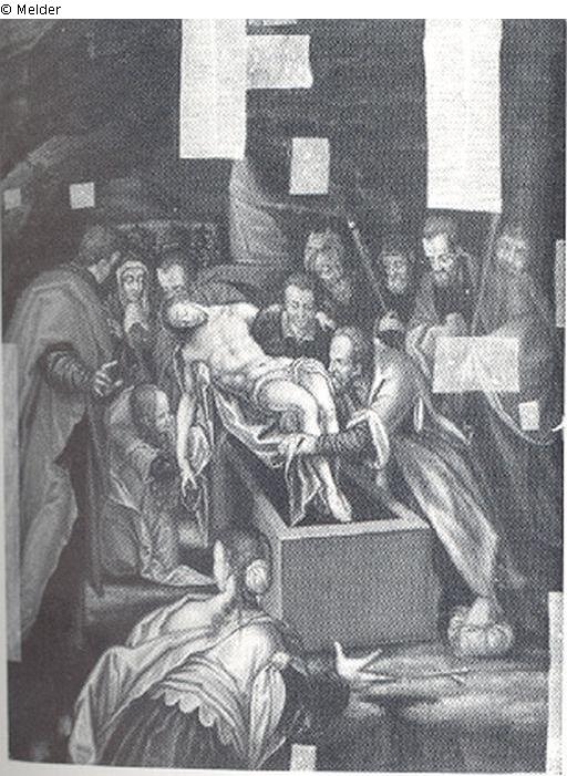 Im Hintergrunde blickt man durch eine Höhlung im Felsen auf ferne Landschaft; Alte Inv.Nr. 9