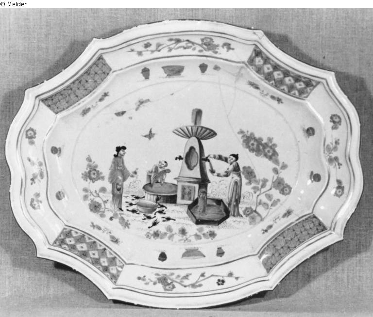 Schnorr von Carolsfeld: (Terrinenuntersatz) mit tiefem ovalem Spiegel und passigem, in zwei flachen Kehlen profiliertem Rand. Bunte Bemalung. Im Spiegel drei um einen Brunnen gruppierte Chinesen im Garten. In der Mitte ein vierseitiges gelbes Postament als Träger einer braunroten Schale, über der eine Fontäne emporsteigt. Rechts vom Postament eine Chinesin, die aus einem der Zapfhähne Wasser in einen Napf fließen läßt. Unten am Postament ergießt sich Wasser aus einer Maske in ein sechseckiges Becken. Links ein rundes Becken, über das sich ein Knabe mit großem Fisch in den Händen beugt. Davor eine Wanne, um die neun schwarze Krebse kriechen. Von links schreitet ein Chinese heran, der eine Blume und einen Henkelkorb trägt. Der Boden angedeutet durch dünne, sich überschneidende Bögen (stilisierte Gräser) und blaßgrün überzogene, schwarz punktierte Streifen. Unten und an den Seiten Blumenstauden und Blüten in Gold, Eisenrot, Gelb, Hellblau und Blaßviolett an blaßvioletten Stielen mit seegrünen Blättern. In der Luft ein Vogel und Schmetterlinge. Gesichter und Hände in abgestuftem Eisenrot, Gewänder in Seegrün, Eisenrot und Purpurviolett. Auf dem inneren Rand einzelne Gefäße und Blumen. In den acht Feldern des äußeren, mit Goldlinien abgesetzten Randes abwechselnd Gittermuster und Blütenzweige. Die äußerste Kante braun abgesetzt. Auf der Rückseite vier eisenrote Blüten. Um 1725. Schwertermarke. - Die Malerei von der gleichen Hand wie die beiden Flaschen Nr. 88-89.