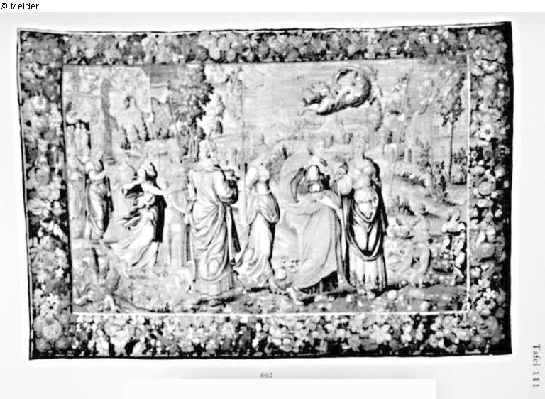 Tapisserie - Hermes schwebt aus den Wolken zu Ceres und ihren Gespielinnen, die sich von einem im Hintergrund liegenden Haus aus in langem Zug vor weiter Landschaft nach rechts bewegen. Breite blumengefüllte Bordüre. Flandern.