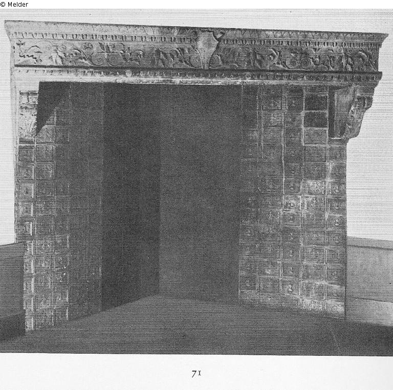 Auf dem an den Kanten fein profilierten Sturz Fries mit symmetrisch sich von einem Wappen als Mittelstück entwickelnden Akanthusranken. Zwei Kämpferträger in Form von Voluten; Quelle: Hans W. Lange: Gemälde und Kunstgewerbe aus einer bekannten Privatsammlung - Verschiedener Kunstbesitz. Berlin. Versteigerung am 22. und 23. Juni 1939. Katalognummer 71 (Kürzel: F.A., Charlottenburg)