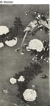 Großes Rollbild in farbiger Malerei auf bräunlicher Seide. Große Schneeballensträucher mit fliegenden Schwalben und blühende Kirschbaumzweige mit zwei Papageien. Montiert mit einer Umrahmung von braun-goldenem Brokat.