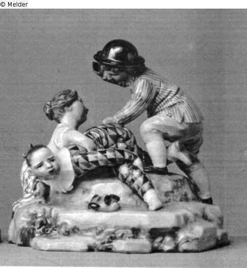 Gegenstück zu der Gruppe "Die erschreckten Kinder". Sockel und Staffierung wie dort, das ältere Mädchen im Harlekinkostüm liegt demaskiert am Boden, wird vom jüngeren festgehalten und von dem Knaben mit der Peitsche geschlagen. Das kleine Mädchen trägt ein blaubordiertes weißes Jäckchen, rotgestreiften weißen Rock und rote Schuhe, der Knabe schwarzen Hut, violett gestreifte Jacke, gelbe Hosen, hechtgraue Strümpfe und schwarze Schnallenschuhe. - Vgl. Hofmann, Frankenthaler Porzellan, Taf. 143, Nr. 577, nach dem unbemalten Exemplar im Berliner Schlossmuseum. Hofmann nennt die Gruppe "Die Kinder und der Wauwau". Blaumarke C T 83 unter Krone. Die Beine eines Knaben gekittet.