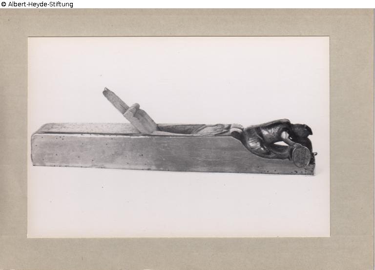 Spantenhobel eines Böttchers. Das Hobelmesser fehlt. Der Kopf des Hobels als vollplastische Figur eines Böttchers gestaltet. Aufschrift auf dem Fassdeckel: „MEMENTO MORI“.